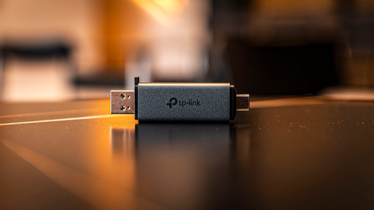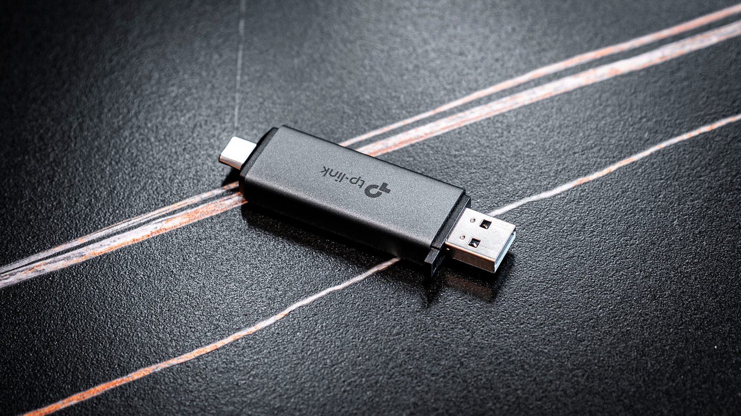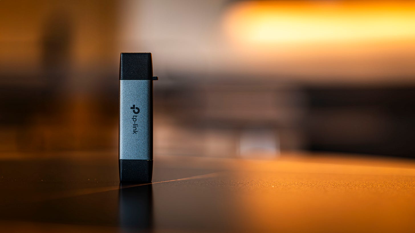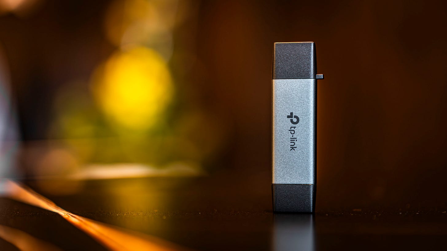 Toàn thân UA430D được bọc nhôm xám mờ với độ hoàn thiện rất ổn áp. Mình rất hay nhét em nó chung trong túi đựng thẻ nhớ, dây sạc, và adapter mỗi khi đi hành nghề. Ấy vậy mà sau gần 1 tuần, da mặt UA430D vẫn trơn tru, không xước xát rõ rệt. Rõ ràng TP-Link không “cook” món này kiểu cho có hay bắt trend, mà là một phụ kiện hướng đến những người dùng chuyên nghiệp thật sự.