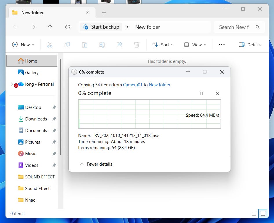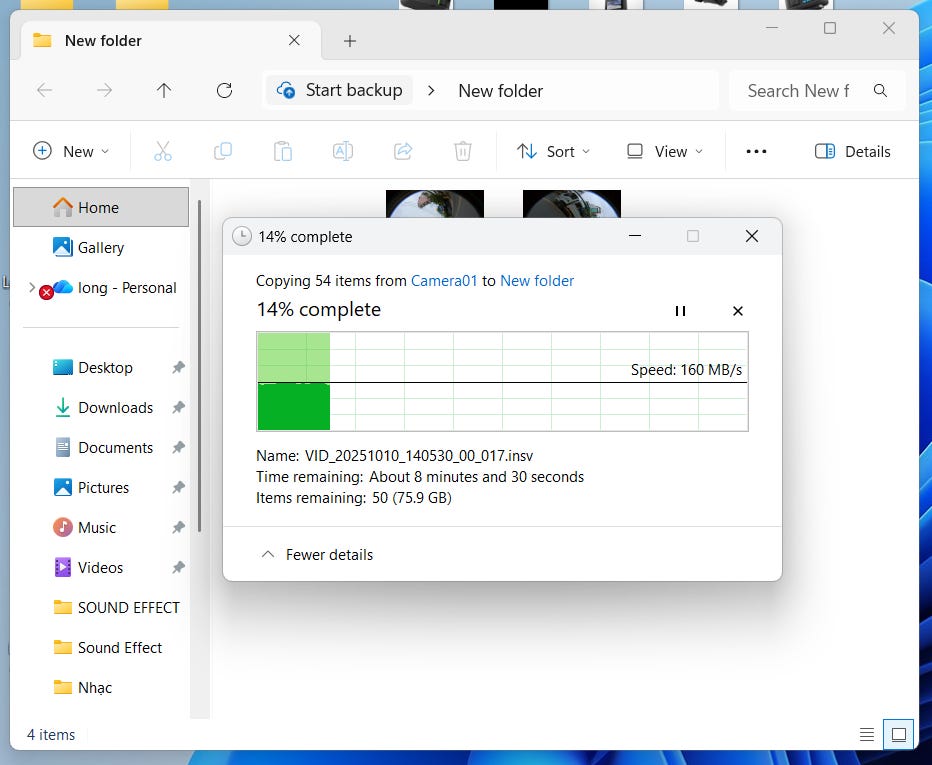 Mình test thực tế bằng cách chép 54 file video Insta360 độ phân giải 5.3K nặng tổng cộng 88,4GB từ thẻ microSD SanDisk Extreme 128GB sang laptop. Không chỉ làm công việc sáng tạo nội dung, mình còn kiêm cả quay dựng video, đặc biệt là các dạng video hành động và chạy xe. Thiết bị mà mình thường quay là action cam Insta360 để quay 360 độ lấy toàn bộ cảnh vật xung quanh, nên việc số lượng file quay nhiều và nặng là điều hết sức bình thường.