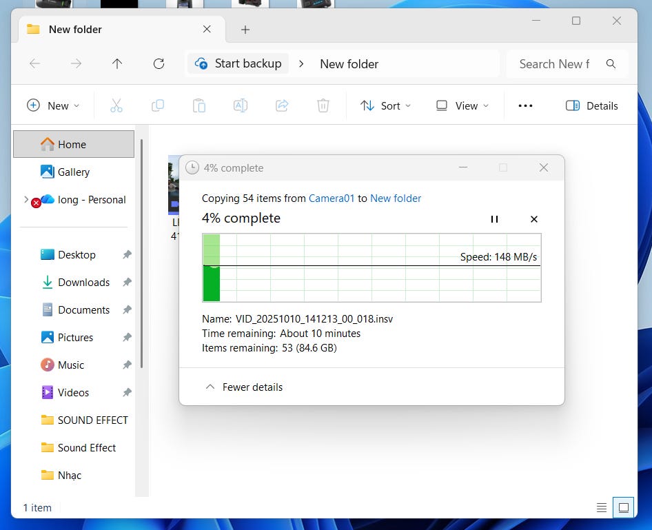 Mình test thực tế bằng cách chép 54 file video Insta360 độ phân giải 5.3K nặng tổng cộng 88,4GB từ thẻ microSD SanDisk Extreme 128GB sang laptop. Không chỉ làm công việc sáng tạo nội dung, mình còn kiêm cả quay dựng video, đặc biệt là các dạng video hành động và chạy xe. Thiết bị mà mình thường quay là action cam Insta360 để quay 360 độ lấy toàn bộ cảnh vật xung quanh, nên việc số lượng file quay nhiều và nặng là điều hết sức bình thường.
