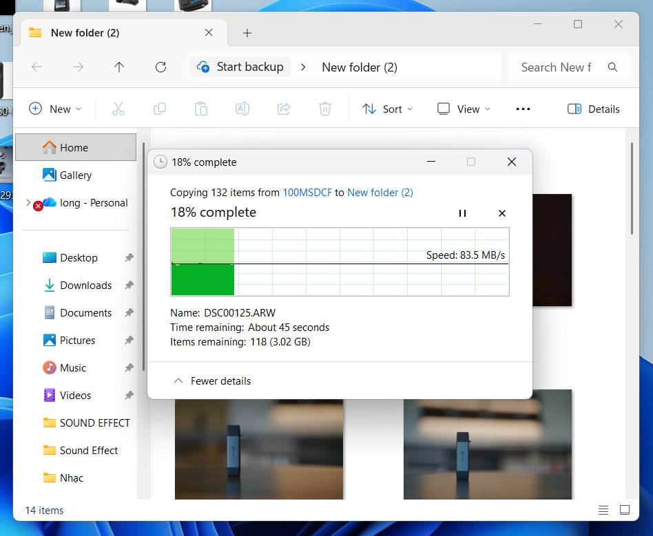 Mình cũng có thử test chuyển 132 file hình RAW dung lượng 3.7GB thì nó chỉ mất đâu đó 30 giây, mặc dù Windows ước tính là tới 45 giây.